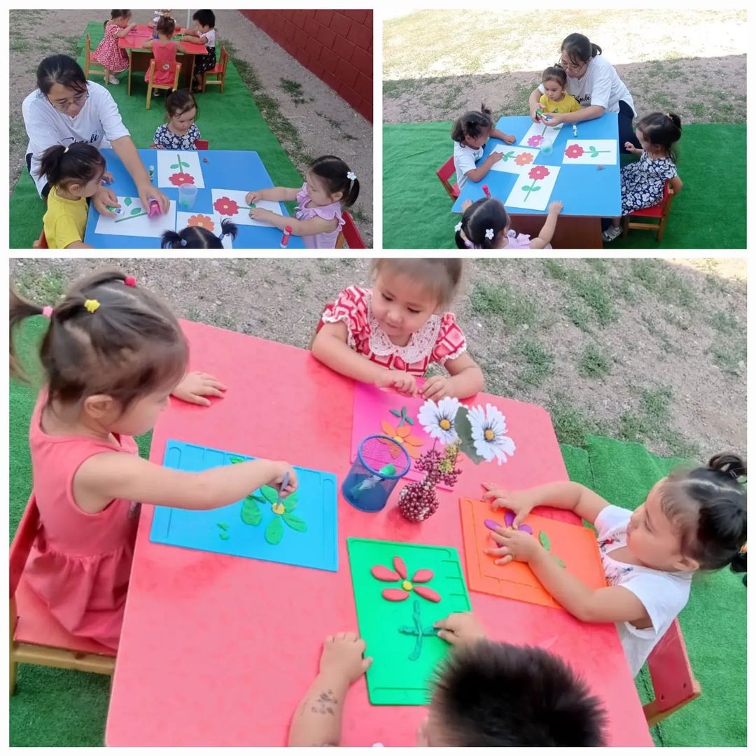 "Балапан"бөбекжай - бақшасында жаздык жоспарға сай "Әсем- гүлдер" атты такырыпта бүлдіршіндерге ұйымдастырылған іс - әрекетті таза ауада түрлі түсті қағаздан және ермексаздан гүлдер бейнесін жасауды тәрбиешілері үйретті