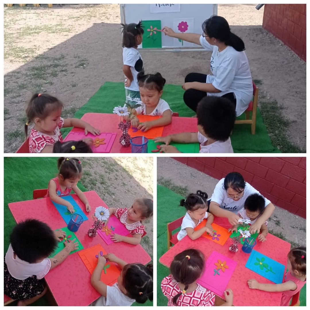 "Балапан"бөбекжай - бақшасында жаздык жоспарға сай "Әсем- гүлдер" атты такырыпта бүлдіршіндерге ұйымдастырылған іс - әрекетті таза ауада түрлі түсті қағаздан және ермексаздан гүлдер бейнесін жасауды тәрбиешілері үйретті