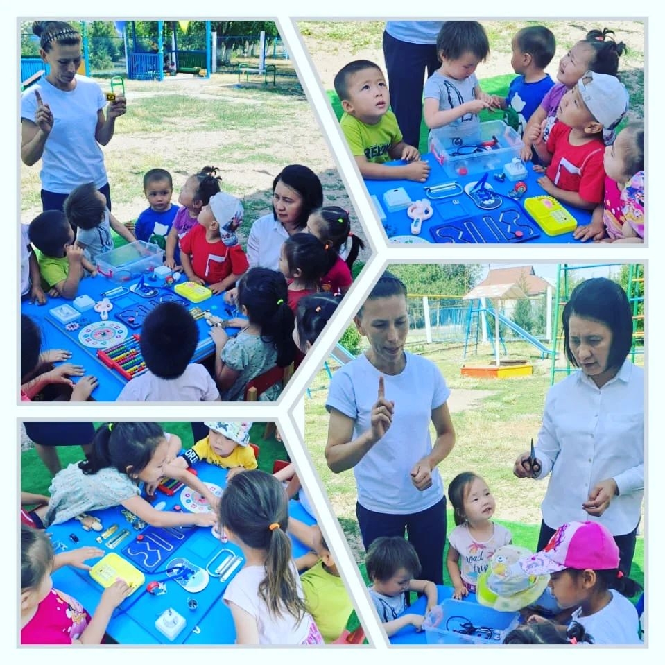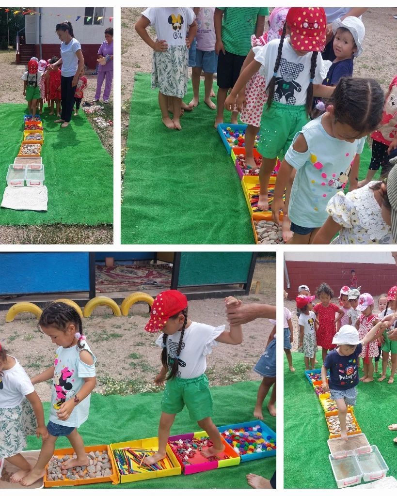 "Балапан" бөбекжай-бақшасының жоспарына сай "Құм, тас, су" атты тақырыпта бүлдіршіндер таза ауада тас, су, құм, таяқша, массаж нүктелер түрлерімен, табанның сезім клеткаларын ояту арқылы, қызықты ойындар ойнатылды.