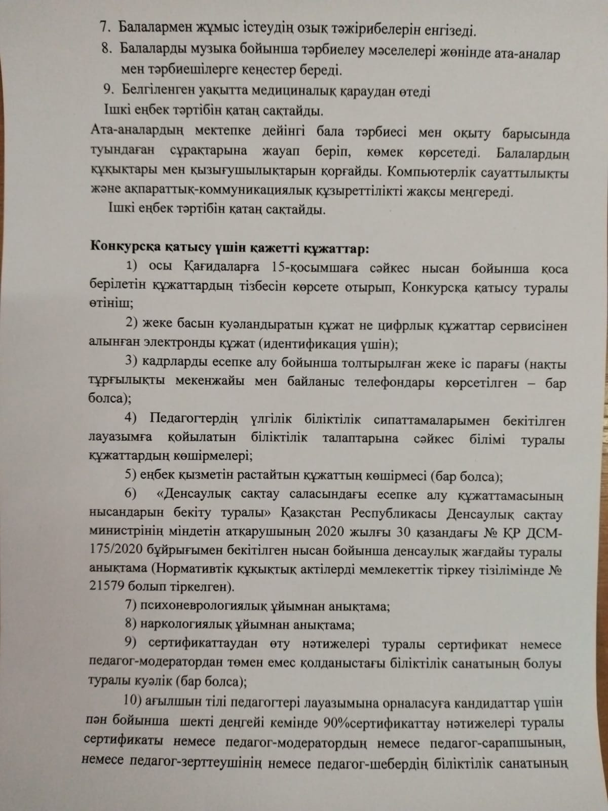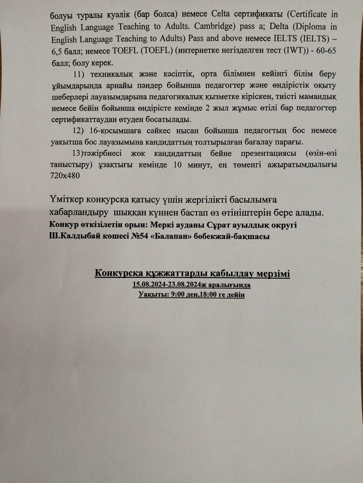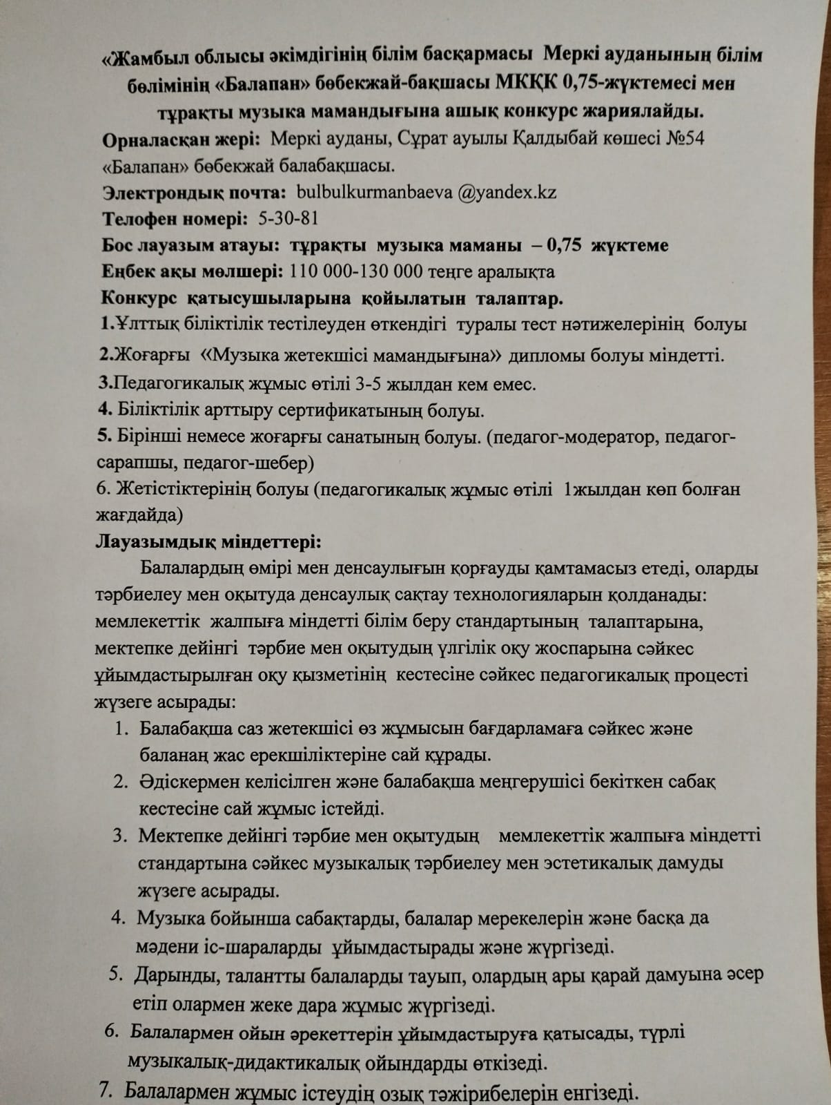 Хабарландыру«Жамбыл облысы әкімдігінің білім басқармасы Меркі ауданының білім бөлімінің «Балапан» бөбекжай-бақшасы МКҚК 0.75-жүктемесі мен тұрақты музыка мамандығына ашық конкурс жариялайды.